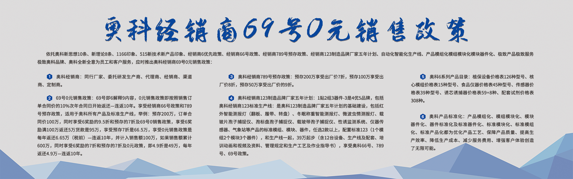 鄭州奧科儀器制造有限公司,是一家集研發、制造和服務為一體的智能設備制造企業,位于河南省鄭州市高新區,擁有科學的管理模式,完善的工藝設施及先進的儀器加工技術和裝備,為保證產品的質量奠定了堅實的基礎。 公司憑借人性化的管理及以德為本、德才兼備的核心管理理念,擁有一批在 農林病蟲草測報設備、氣象傳感器、土壤食品快檢儀器、